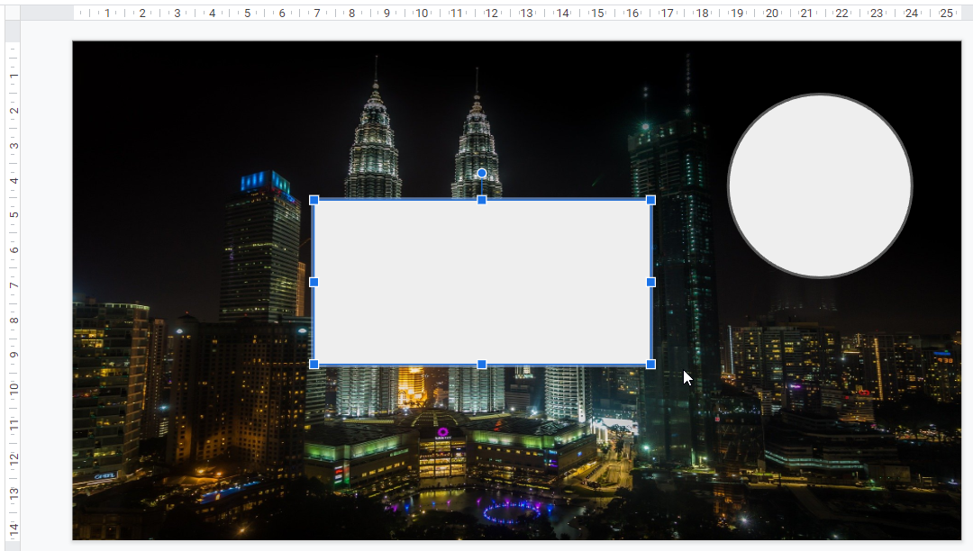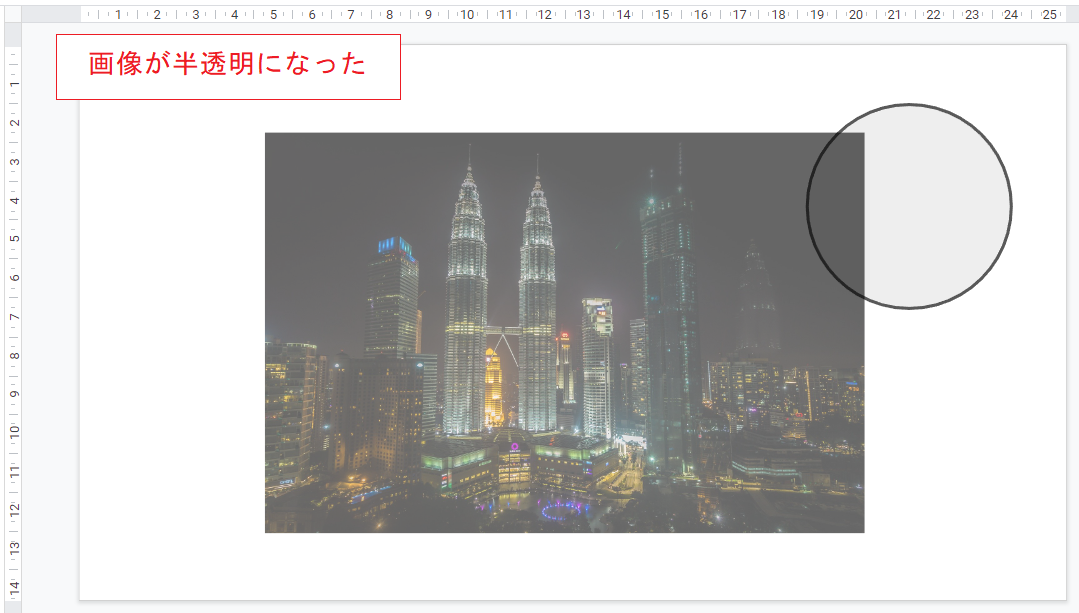 これで背景画像が透過しているような感じになりましたが、先にあった右上の円形の塗りつぶし色と枠線色も一緒に薄くなってしまいました(わかりにくいですが)。これは長方形の方が前面(手前)にあるからです。