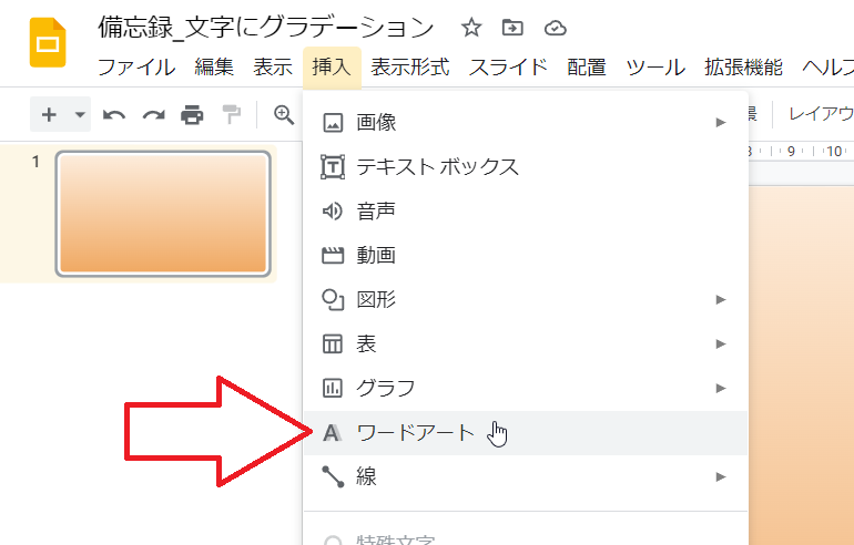 そのままワードアートを選択した状態で、メニューからバケツのアイコン(塗りつぶしの色)を選択し、グラデーションのタブを選択します。