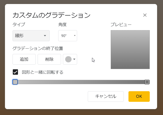 詳細は省略しますが、グラデーションの形状や向き、開始と終了地点の色などを設定できます。