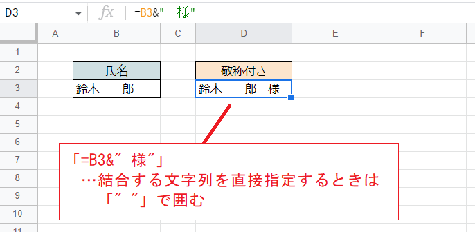 ここではB3セルの文字列と、直接指定した文字列(「 様」という2文字)を結合しています。