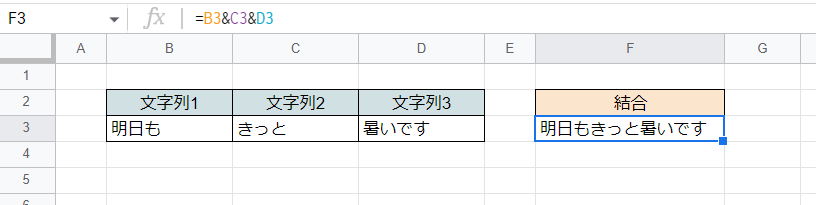 対象となるセルを1つ1つ指定するのではなく、1つの範囲として「B3:D3」と指定することで、含まれるすべての文字列を結合した結果を得ることができます。