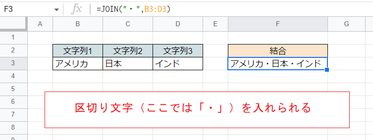 JOIN関数を使うと、結合するそれぞれの文字列の間に区切り文字を入れることができます。