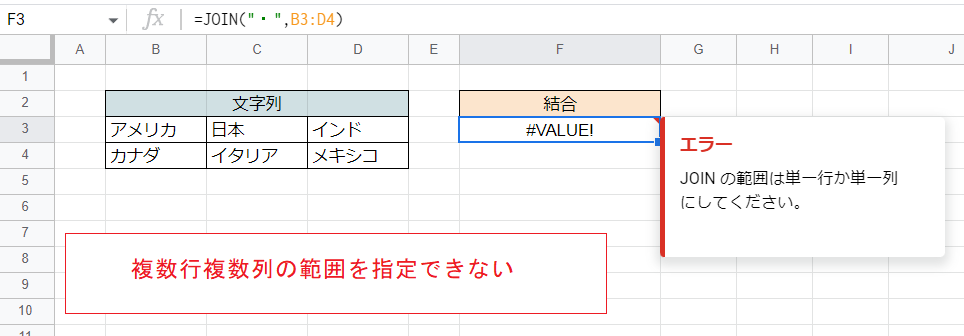 ところでJOIN関数では、1行または1列の範囲しか結合することができず、複数行複数列の範囲を結合しようとするとエラーになります。