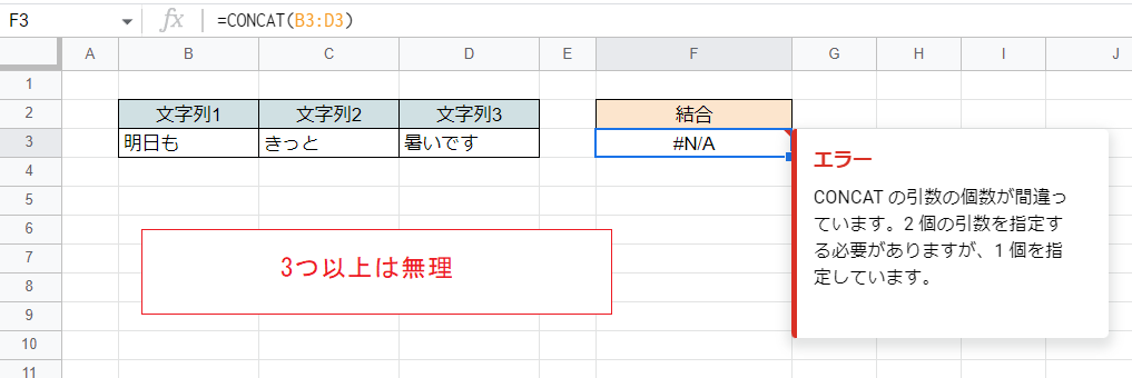 次のように3つ以上のセルを指定するとエラーになります。「=CONCAT(B3,C3,D3)」としてもダメです。