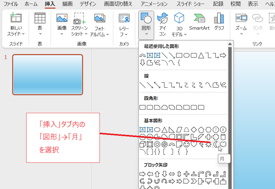 そこで「挿入」タブ内から「図形」→「月」と選択します。