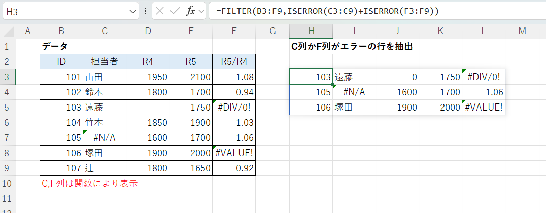H3セルにFILTER関数を使った式を入力して、どちらかの列もエラーでない行を抽出しています。