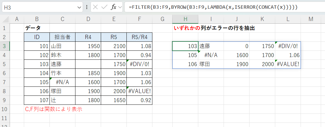 考え方は1つ上の例と同様ですがちょっと難しくなります。BYROW/LAMBDA/ISERROR/CONCAT関数を使うことで各行のB~F列の値をそれぞれ結合した結果の配列を取得しています(いずれかの列がエラーならTRUEとなります)。これをFILTER関数の引数とすることで、B~F列のいずれかの列がエラーである行を抽出しています。