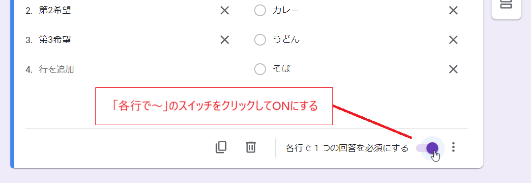 続いて右下にある「各行で1つの回答を必須にする」のトグルスイッチをクリックしてONにします。