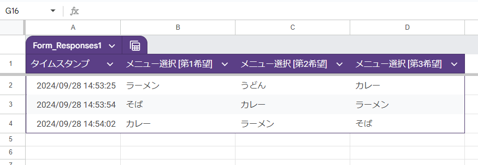 回答をスプレッドシートに反映させた様子です。
